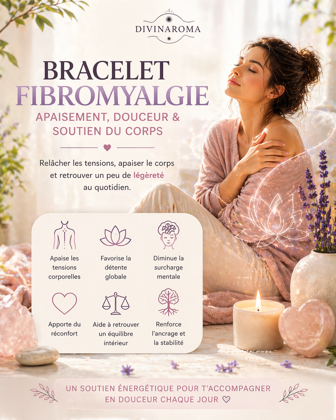 T’accompagne pour te recentrer, retrouver une forme de stabilité intérieure malgré les fluctuations du corps. Il aide à réharmoniser tes ressentis et à te sentir plus aligné(e).