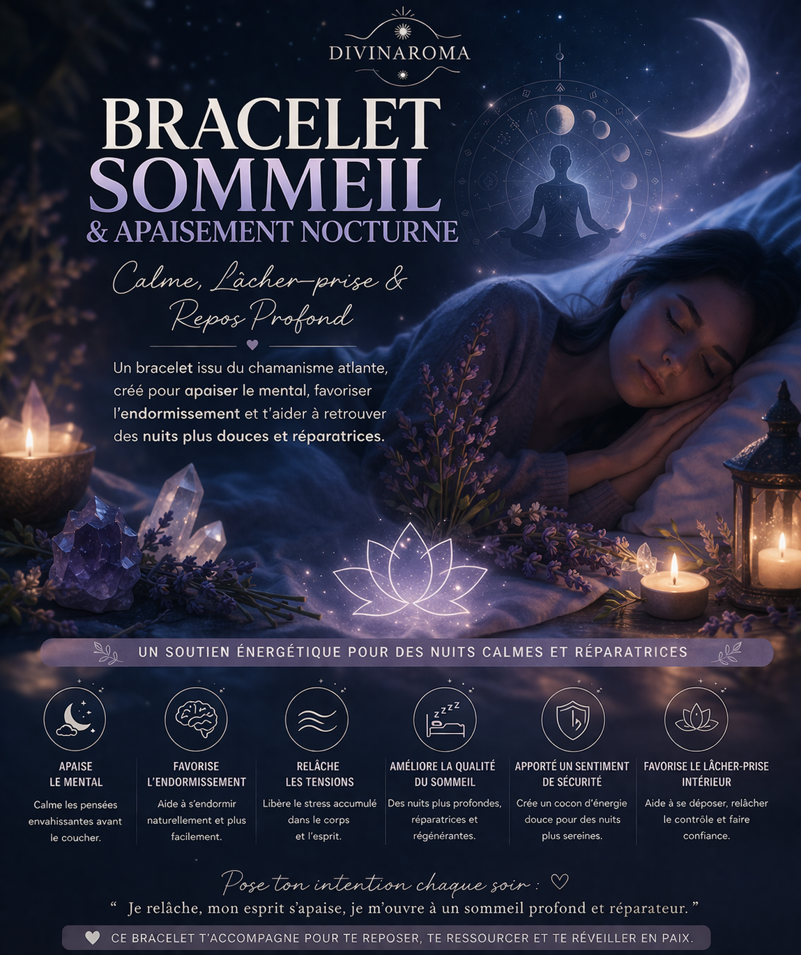 Un bracelet issu du chamanisme atlante, créé pour apaiser le mental, favoriser l’endormissement et t’aider à retrouver des nuits plus douces et réparatrices.
