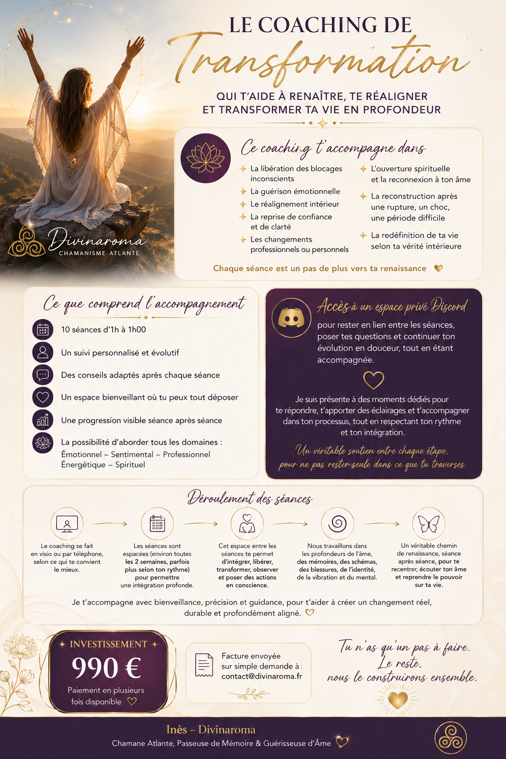 C’est un accompagnement profond et transformationnel en quelques séances, tu vas voir plus clair dans ta situation, comprendre ce qui te bloque vraiment, te libérer progressivement de certaines charges émotionnelles retrouver plus de stabilité intérieure, prendre des décisions plus justes, commencer à te repositionner dans ta vie et au fil des séances tu arrêtes de tourner en rond, tu te sens plus alignée, tu avances concrètement et surtout tu reprends le contrôle de ta vie.